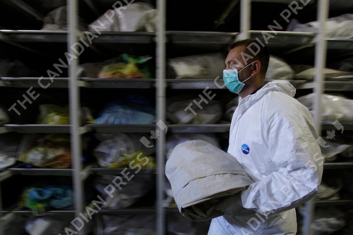 FILE - In this Thursday, July 7, 2011 file photo Bosnian worker Ermin Nuhanovic carries bags of body remains during a process of reassociation and identification of human remains, exhumed from mass graves and identified by DNA, in the identification center in Tuzla, 140 kms north from Sarajevo,Bosnia. A Bosnia-based commission that has pioneered a DNA-based system to find and identify the remains of people missing in conflicts and natural disasters will become a permanent global body helping track down millions of missing around the world, officials said Thursday, Dec. 4, 2014. (AP Photo/Amel Emric, File)