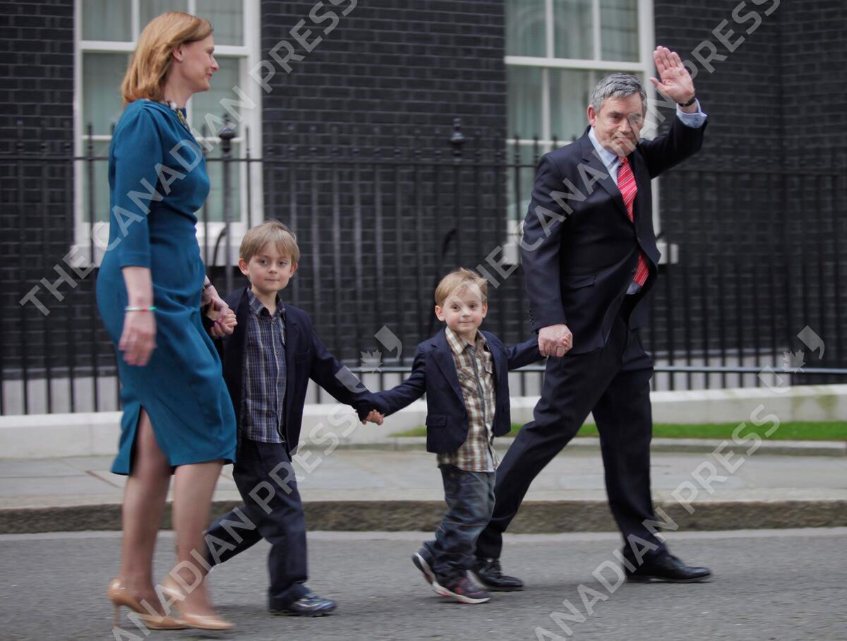 FILE - In this Tuesday May 11, 2010 file photo, Britain's Prime Minister Gordon Brown accompanied by his wife Sarah and their children, John, 2nd right, and Fraser, leaves his official residence at No. 10 Downing Street in central London, after he announced his resignation. Rivals and allies are paying tribute to former British Prime Minister Gordon Brown, who plans to step down from Parliament at a national election in May. Brown is due to make a speech Monday Dec. 1, 2014 in his home town of Kirkcaldy, Scotland. British media say he will announce he is leaving Parliament after 32 years. (AP Photo/Lefteris Pitarakis, File)