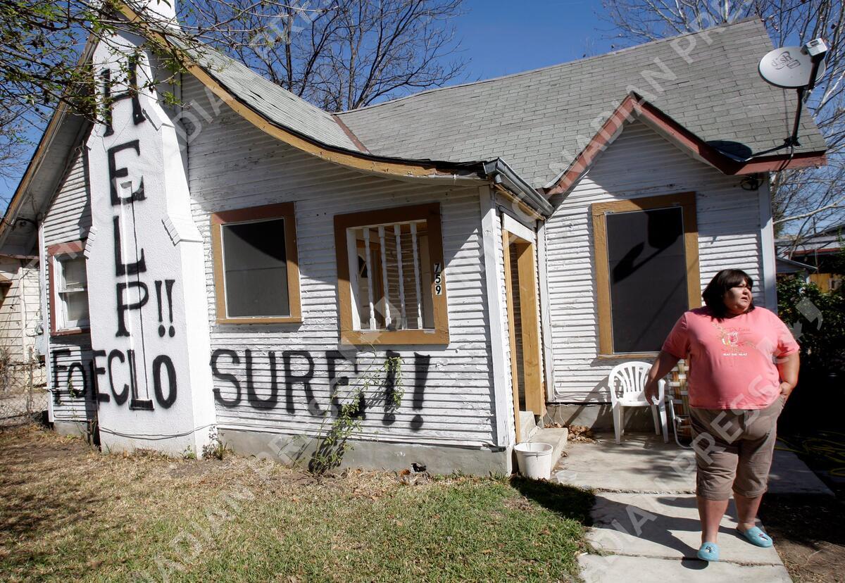 FILE - In this Feb. 23, 2009 file photo, Mary Ann Herrera stands outside her home in San Antonio, Monday, Feb. 23, 2009. Under the threat of foreclosure, Herrara's brother painted the words "Help!!" and "Foreclosure!!" on her home in the hopes of receiving assistance. Six years after the collapse of Lehman Brothers, the lessons of the financial crisis may already be fading from memory. (AP Photo/Eric Gay, File)