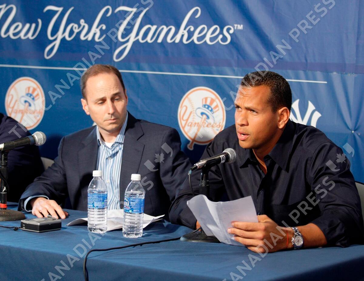 FILE - In this Feb. 17, 2009, file photo, New York Yankees' Alex Rodriguez reads a statement to the media alongside Yankees general manager Brian Cashman after arriving at George Steinbrenner Field in Tampa, Fla. Alex Rodriguez isn't yet at the weight the New York Yankees want him to be at when he reports to spring training in two months. Yankees general manager Brian Cashman said Matthew Krause, the team's strength and conditioning coordinator, visited A-Rod on Wednesday, Dec. 10, 2014, in Miami. (AP Photo/Gene J. Puskar, File)