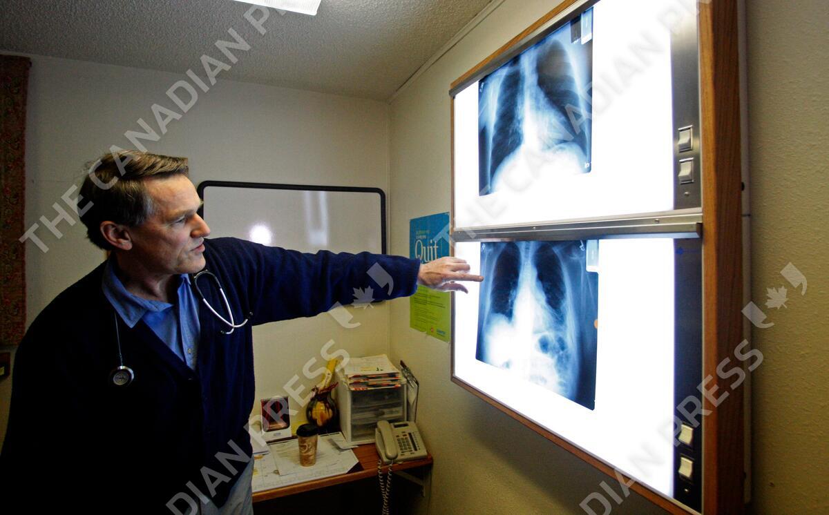 FILE - In this Feb. 18, 2010 file photo, Dr. Brad Black, director of the Libby, Mont., asbestos clinic, looks at X-rays. A long-delayed risk study released Monday, Dec. 8, 2014 for the Montana mining town where hundreds have died from asbestos exposure concludes that even a minuscule amount of the substance can lead to lung problems. The 328-page draft document will guide the remaining cleanup of asbestos dust from a W.R. Grace & Co. vermiculite mine outside Libby, a town of 2,600 people located about 50 miles south of the Canada border. The scenic mountain community has become synonymous with asbestos dangers since news reports 15 years ago first drew attention to the number of people dying from exposure. (AP Photo/Rick Bowmer, File)
