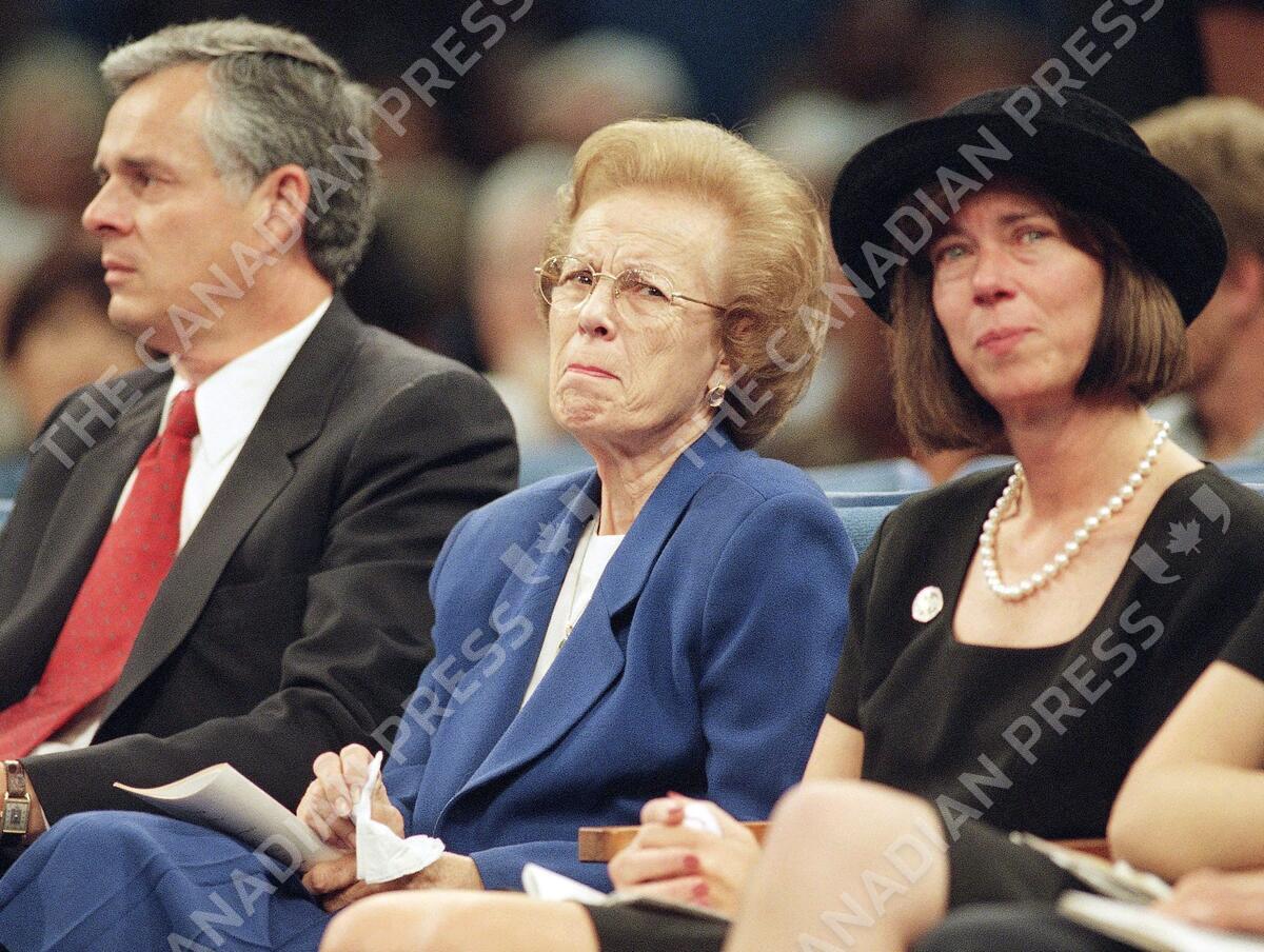FILE - In this Oct. 17,1997 file photo Ramona Hahn, wife of the late supervisor Kenneth Hahn flanked by her son Jim, left and daughter, Janice, during a memorial service for her husband at the Crenshaw Christian Center in Los Angeles. Ramona Hahn, the matriarch of a Los Angeles political family, has died at 86. Hahn was the wife of the late Los Angeles County Supervisor Kenneth Hahn, and the mother of former Mayor James Hahn and City Councilwoman Janice Hahn. (AP Photo/Michael Caulfield)