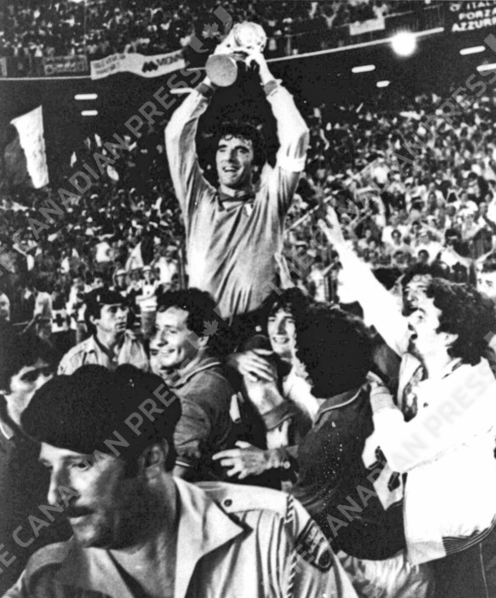 FILE - In this July 11, 1982 file photo, Italian team captain and goalkeeper Dino Zoff, is raised aloft by his teammates while holding the World Cup in the Santiago Bernabeu Stadium, in Madrid, after Italy defeated West Germany 3-1 in the World Cup final soccer match. On this day: After a 44 year interval Italy finally wins its third World Cup. (AP Photo/File)