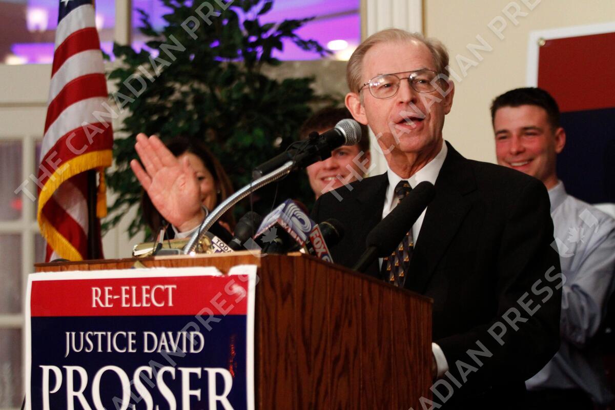 FILE - In this April, 2011, file photo, Justice David Prosser speaks to supporters at the Seven Seas Restaurant in Waukesha Wis. as he takes on Assistant Attorney General JoAnne Kloppenburg for a Wisconsin Supreme Court seat. Prosser recused himself from a drunken driving case earlier this year after he apparently went outside court proceedings and asked questions of a state lab. (AP Photo/Darren Hauck, File)