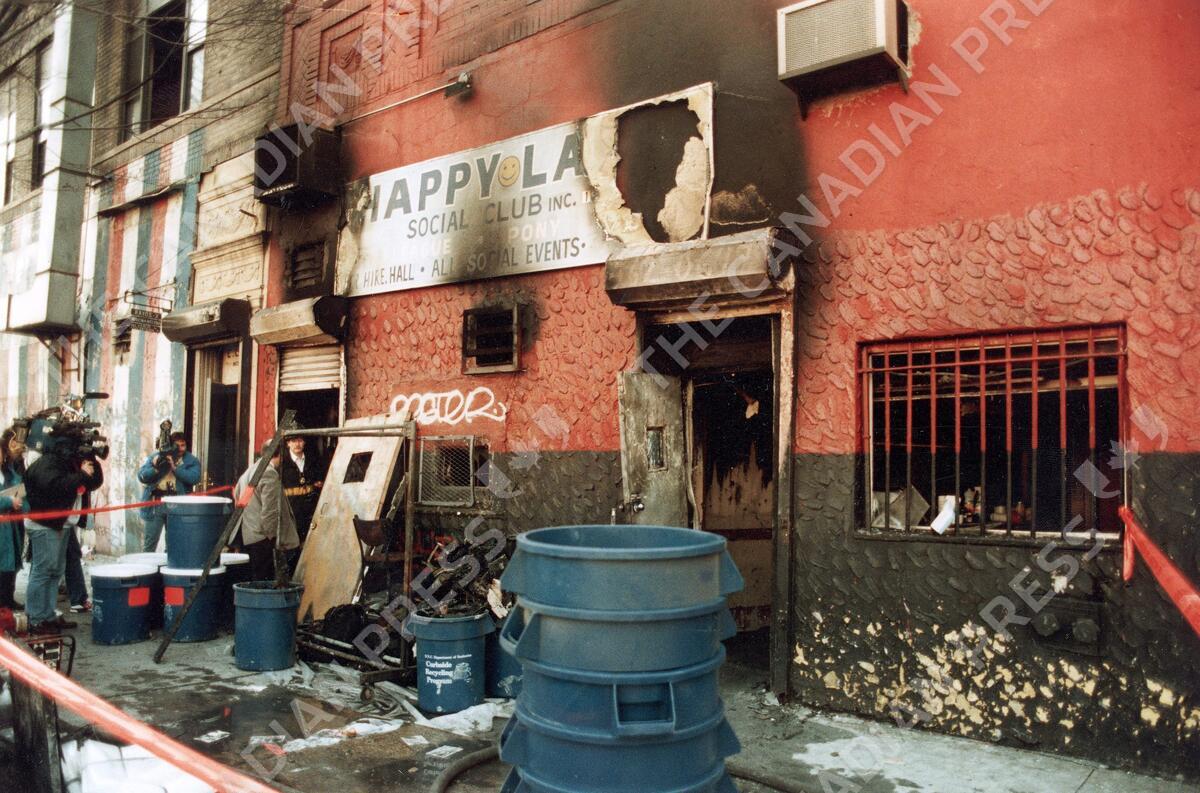 In this 1990 file photo, news crews report on an arson fire at the Happy Land social club in which 87 people perished, in the Bronx borough of New York. March 25, 2015, marks the quarter-century anniversary of what was then the biggest mass murder in modern U.S. history. (AP Photo)