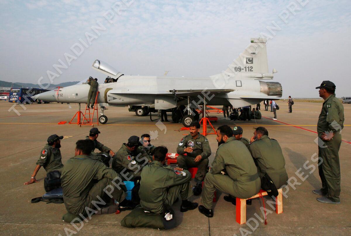 FILE - In this Nov. 21, 2010, file photo, Pakistan Air Force personnel sit in front of their JF-17 jet fighter at the 8th China International Aviation and Aerospace Exhibition (Zhuhai Airshow) in Zhuhai, southern coast of Guangdong province, China. China has overtaken Germany to become the world’s third-biggest arms exporter, although its 5 percent of the market remains small compared to the combined 58 percent of exports from the U.S. and Russia, a new study says. (AP Photo/Kin Cheung, File)