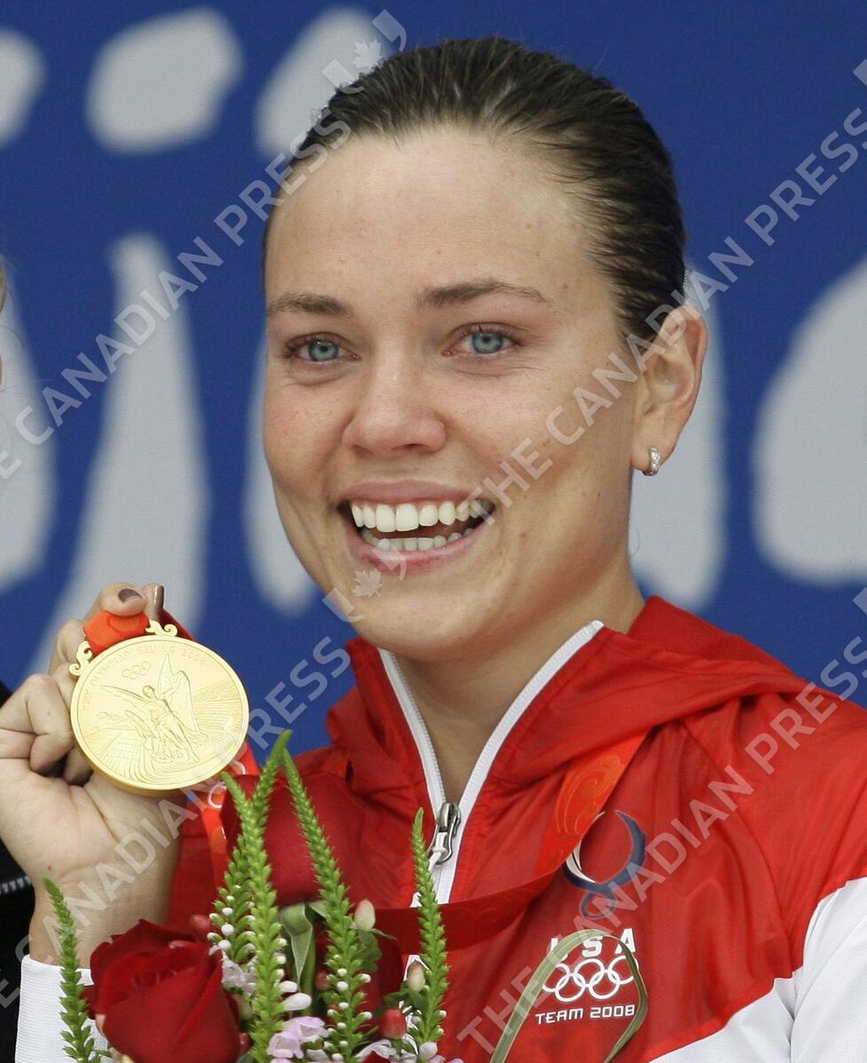 FILE - In this Aug. 12, 2008, file photo, Natalie Coughlin shows off her gold medal after the women's 100-meter backstroke final at the Beijing 2008 Olympics in Beijing. Coughlin plans to use the Pan American Games in Toronto as a stepping stone to what could be a historic Olympic performance. The 12-time Olympic medallist will become the most decorated American female swimmer in history if she captures one more medal next year at the Rio Games. (AP Photo/David J. Phillip, File)