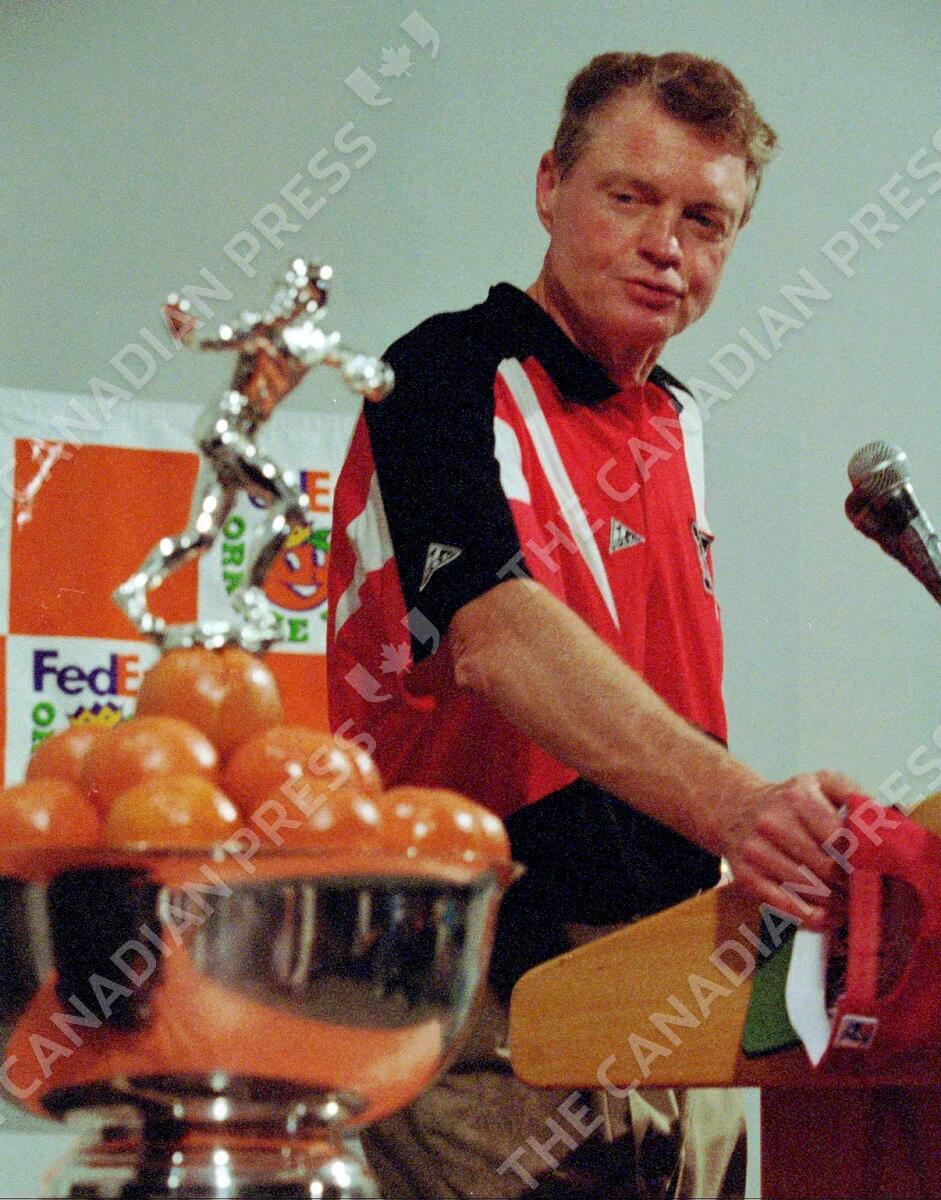 FILE - In this J an. 1, 1995, file photo, Nebraska coach Tom Osborne looks at the NCAA college football FedEx Orange Bowl trophy during a post-game news conference in Miami. Top-ranked Nebraska defeated Miami 24-17. The Miami and Nebraska programs are but a shell of their former selves as they enter Saturday night's game in Lincoln. (AP Photo/Hans Deryk, File)