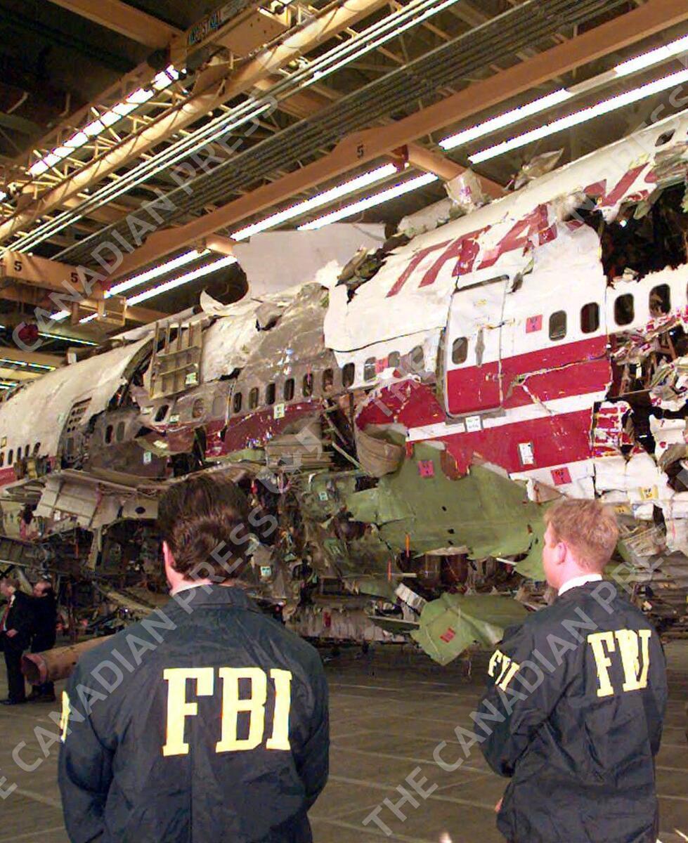 ** ADVANCE FOR SUNDAY JULY 16 ** FILE ** FBI agents and New York state police guard the reconstruction of TWA Flight 800 in Calverton, N.Y., in this Nov. 19, 1997, file photo. Federal investigators determined that ten years ago TWA 800 was destroyed by a fuel-tank explosion, likely caused by a spark from a short-circuit in the Boeing 747's wiring that ignited the tank's vapors. But conspiracy theories that say the plane was blown up by a terrorist's missile or the U.S. government have persisted over the past decade - even among some family members. (AP Photo/Mark Lennihan)