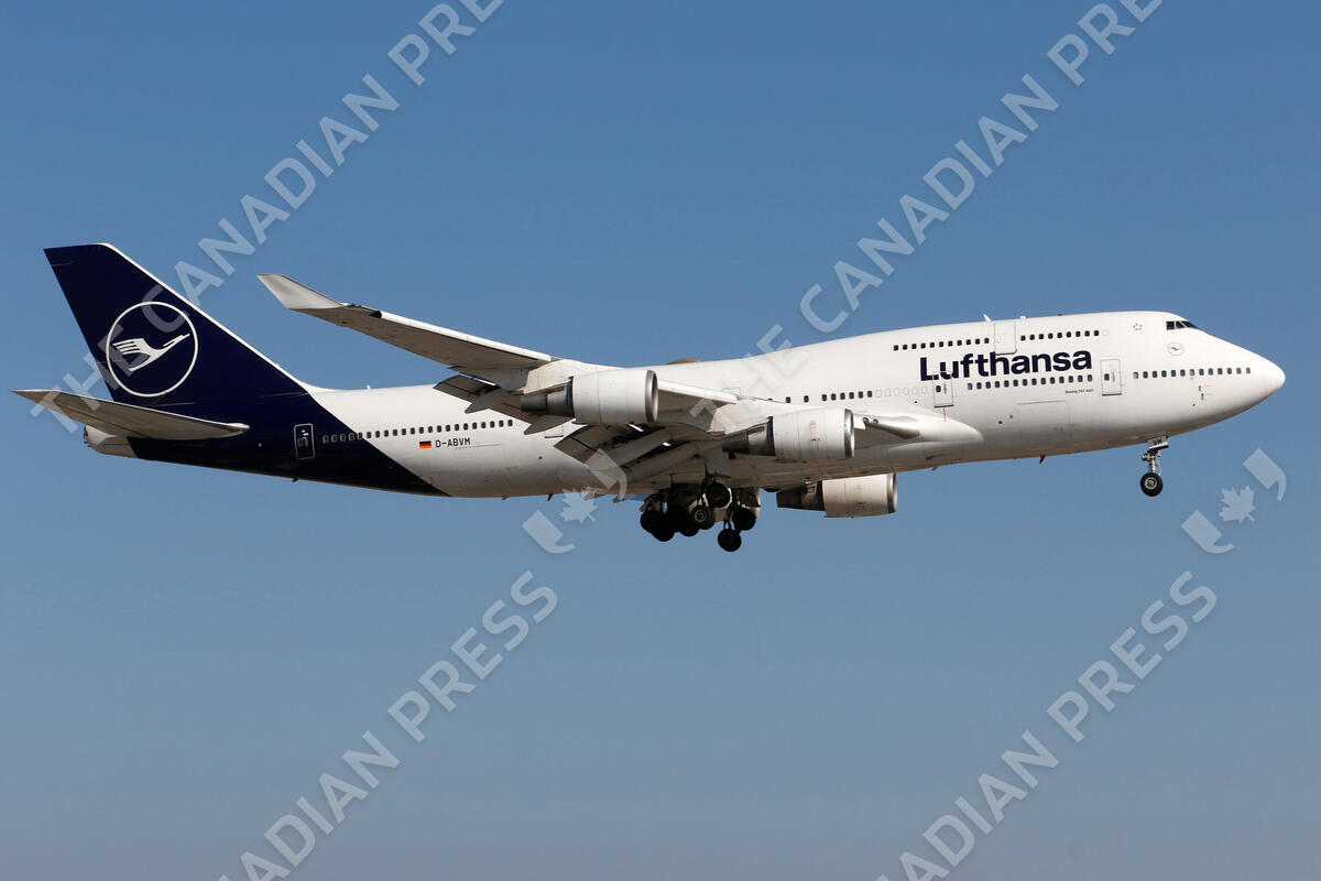 A Boeing 747 (747-400) jetliner, belonging to Lufthansa, lands at Toronto Pearson International Airport in Mississauga, Ontario on April 27, 2023. THE CANADIAN PRESS IMAGES/Larry MacDougal