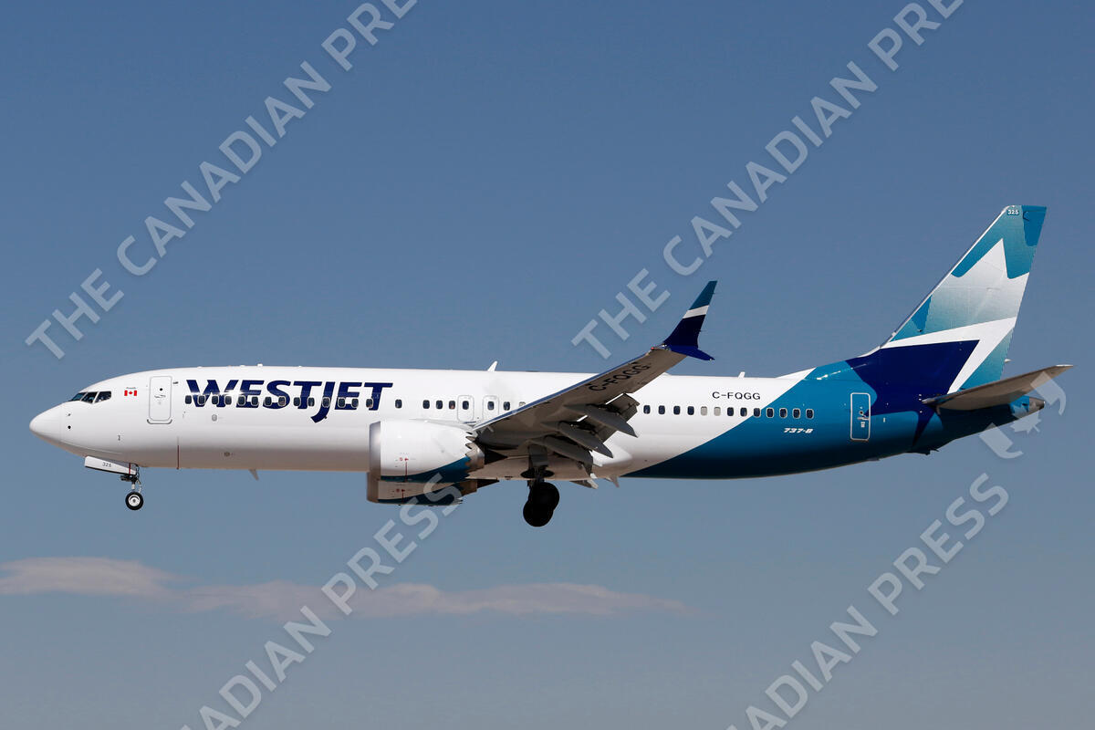 A Boeing 737-8 (MAX 8) jetliner, belonging to WestJet Airlines, lands at Harry Reid (formerly McCarren) International Airport in Las Vegas, Nv., on March 3, 2023. THE CANADIAN PRESS IMAGES/Larry MacDougal