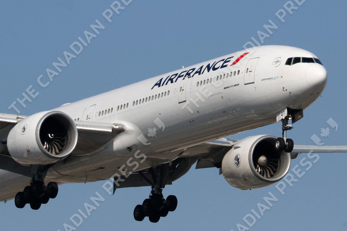 A Boeing 777 (777-300) jetliner, belonging to Air France, lands at Toronto Pearson International Airport in Mississauga, Ontario on April 27, 2023. THE CANADIAN PRESS IMAGES/Larry MacDougal