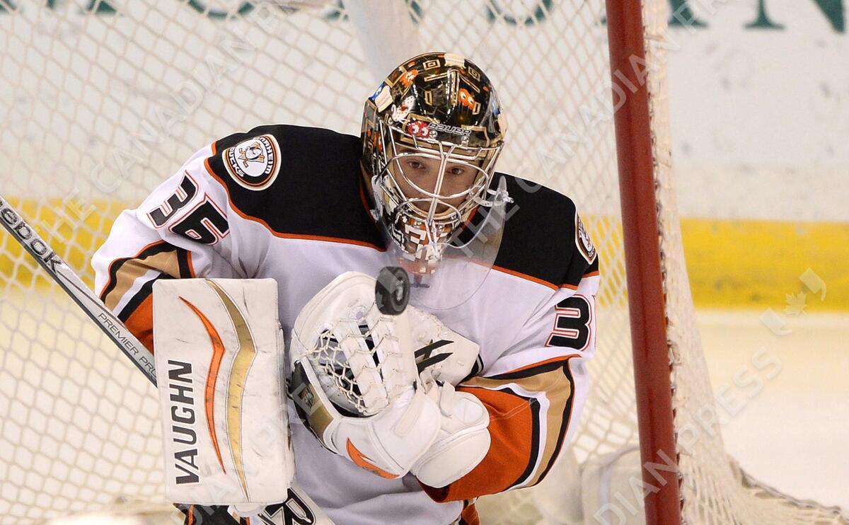 FILE - In this Oct. 20, 2014 file photo, Anaheim Ducks goalie John Gibson (36) blocks a shot against the St. Louis Blues in an NHL hockey game in St. Louis. The Ducks announced Monday, Sept. 21, 2015 that Gibson has agreed to a three-year, $6.9 million contract extension with the Anaheim Ducks. The 22-year-old Gibson is considered one of the top young goalies in hockey, and he has won 16 NHL games over the past two seasons with the Ducks. (AP Photo/Bill Boyce, File)