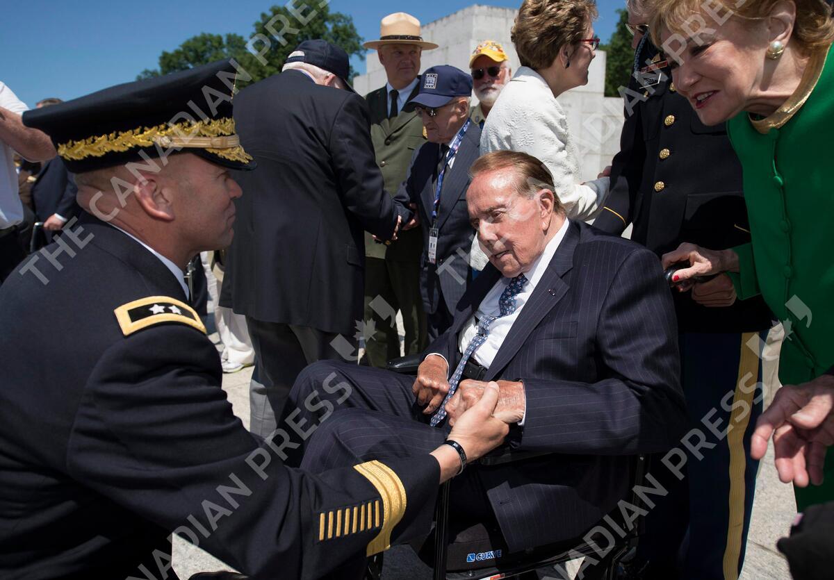 FILE -In this May 24, 2014 file photo, WWII veteran and former Senate Majority Leader Bob Dole, accompanied by his wife Elizabeth Dole, is greeted by Major Gen. Jeffrey Buchanan after taking part in a wreath laying ceremony at a 10th anniversary ceremony for the WWII Memorial in Washington. Dole is planning an ambitious fundraising effort to build the long-debated Dwight D. Eisenhower Memorial in Washington. Dole wants to honor Ike, one of Kansas’ favorite sons, and Dole also led in raising $170 million to build the National World War II Memorial on the National Mall. (AP Photo/Molly Riley, File)