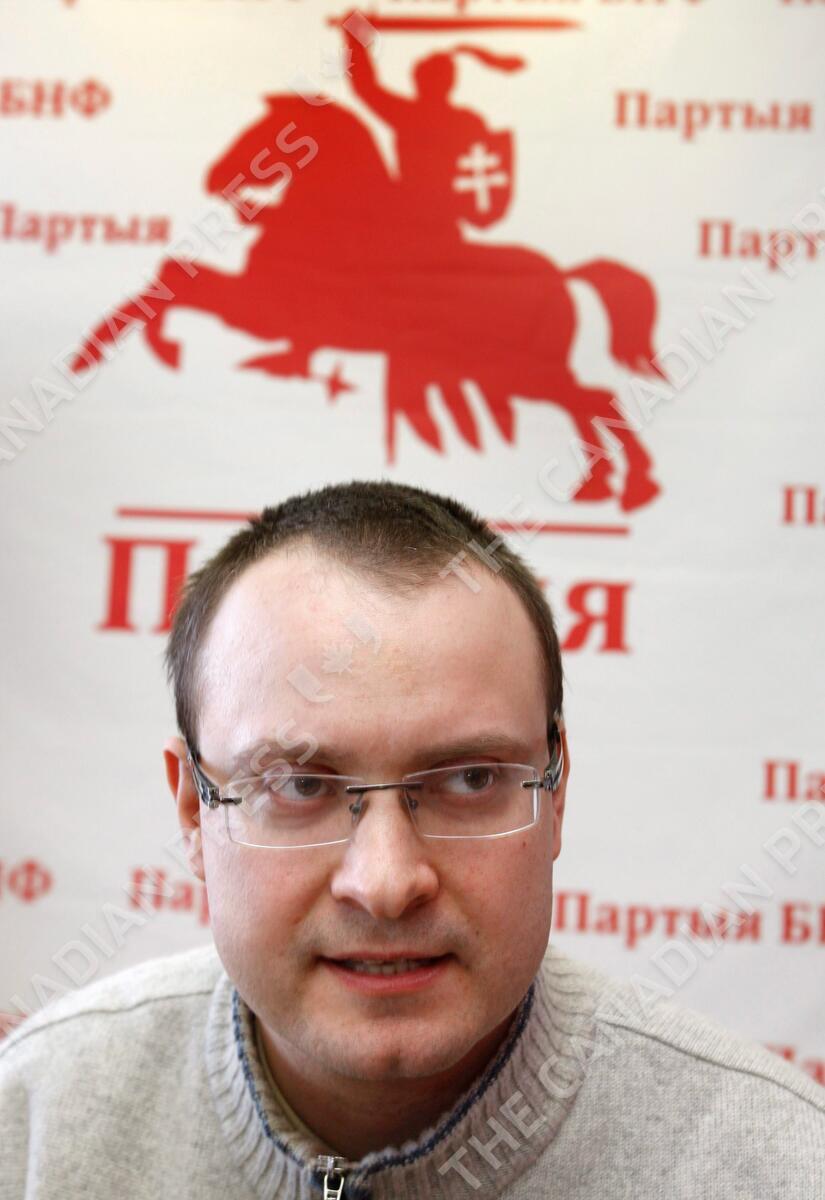 FILE - In this file photo taken on Monday, Feb. 28, 2011, Ales Mikhalevich, a candidate in Belarus' 2010 presidential election, is seen with banned national emblem behind in Minsk, Belarus. Mikhalevich was arrested after the election and later gained political asylum in Czech Republic, and has now, Tuesday Sept. 8, 2015, been arrested while returning to Belarus after four years in exile. (AP Photo/Sergei Grits, FILE)