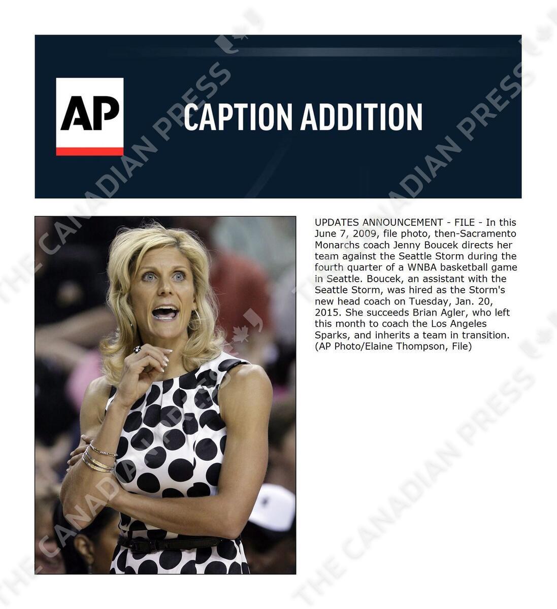 UPDATES ANNOUNCEMENT - FILE - In this June 7, 2009, file photo, then-Sacramento Monarchs coach Jenny Boucek directs her team against the Seattle Storm during the fourth quarter of a WNBA basketball game in Seattle. Boucek, an assistant with the Seattle Storm, was hired as the Storm's new head coach on Tuesday, Jan. 20, 2015. She succeeds Brian Agler, who left this month to coach the Los Angeles Sparks, and inherits a team in transition. (AP Photo/Elaine Thompson, File)