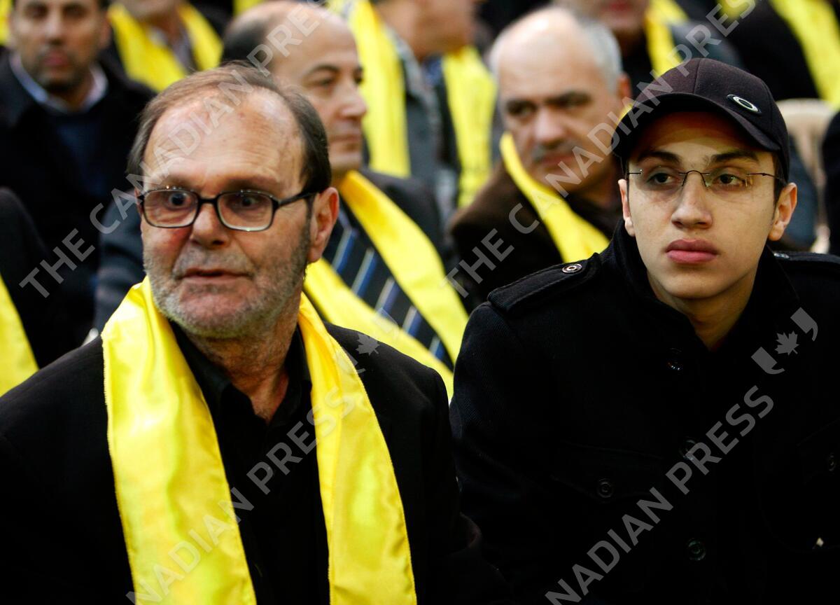 FILE - In this Feb. 16, 2009, file photo, Fayez, left, father of Imad Mughniyeh, and Jihad, the son of slain top Hezbollah's commander Imad Mughniyeh, attend a rally commemorating the first anniversary of Imad Mughniyeh's assassination in the southern suburb of Beirut, Lebanon. A Hezbollah official said Sunday, Jan. 18, 2015, that an Israeli strike in the Syrian Golan Heights killed Jihad Mughniyeh and four other fighters from the Lebanese Shiite militant group. (AP Photo/Hussein Malla, File)