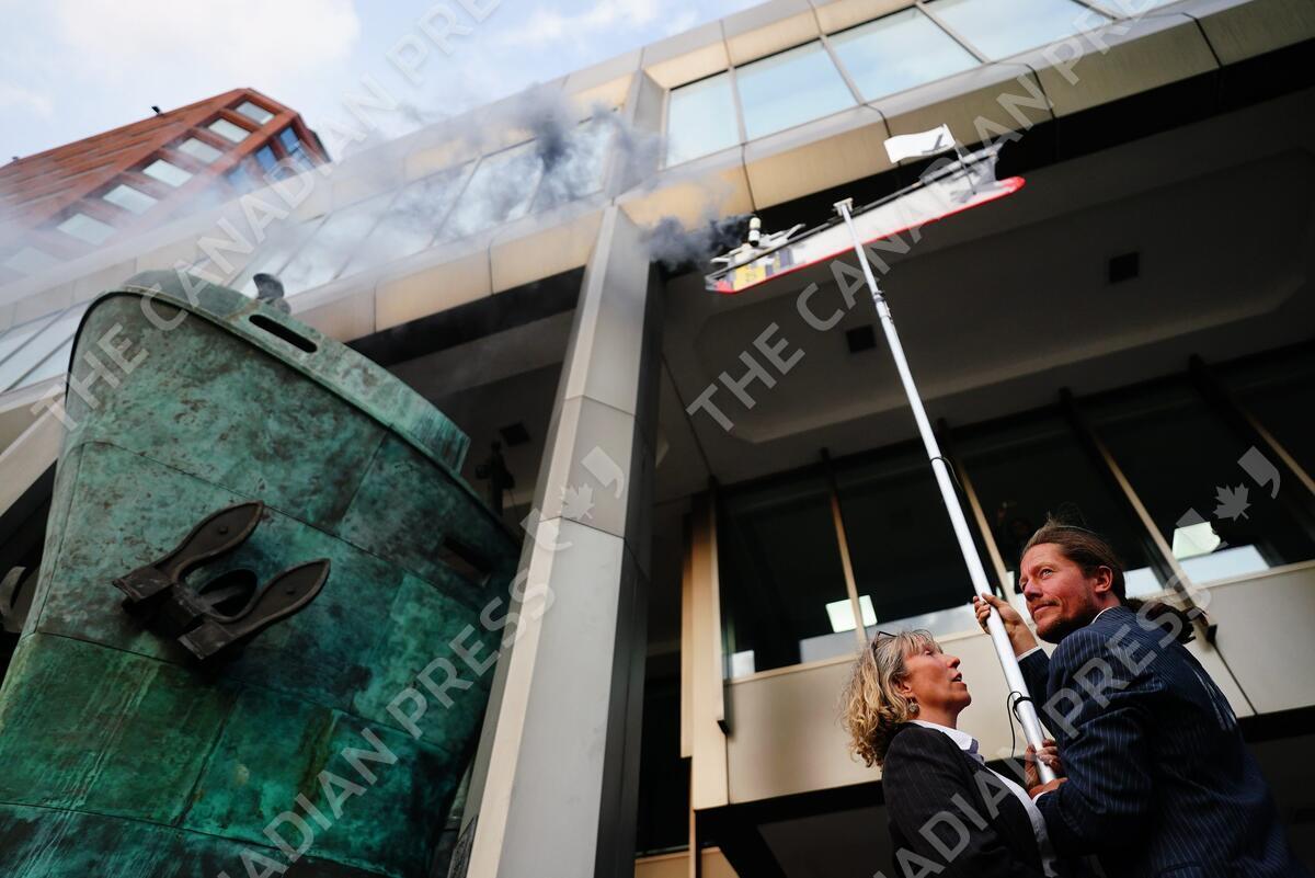 Ocean Rebellion protesters target the International Maritime Organisation (IMO) MEPC 80 meeting in central London. Using a 4 foot puppet oil tanker belching smoke from its chimneys and a flaming oil drum to interrupt the evening drinks reception. Picture date: Monday June 26, 2023.