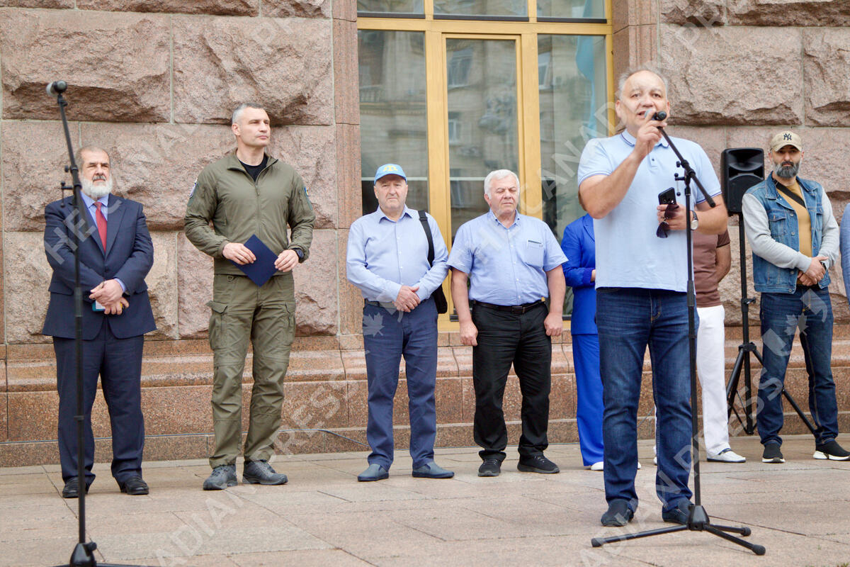 June 26, 2023, Kyiv, Ukraine: Head of the Crimean Tatar Resource Centre, head of the Department for Legal Affairs and Foreign Affairs of the Mejlis of the Crimean Tatar people Eskender Bariiev delivers a speech during the celebration of Crimean Tatar Flag Day outside the Kyiv City State Administration building in Kyiv, capital of Ukraine. (Credit Image: © Kirill Chubotin/Ukrinform via ZUMA Press Wire)
