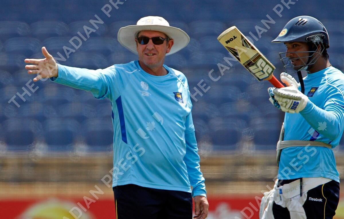 FILE - This is a Saturday, Feb. 19, 2011 file photo of Sri Lanka's coach Trevor Bayliss, left,s he talks with captain Kumar Sangakkara during a practice session at Mahinda Rajapaksa International Cricket Stadium in Hambantota, Sri Lanka. England on Tuesday May 26, 2015, hired Trevor Bayliss as its new head cricket coach, and the Australian will take charge of the side for the first time in the opening Ashes test on July 8. Bayliss currently coaches domestic Australian cricket side New South Wales. (AP Photo/Andres Leighton, File)
