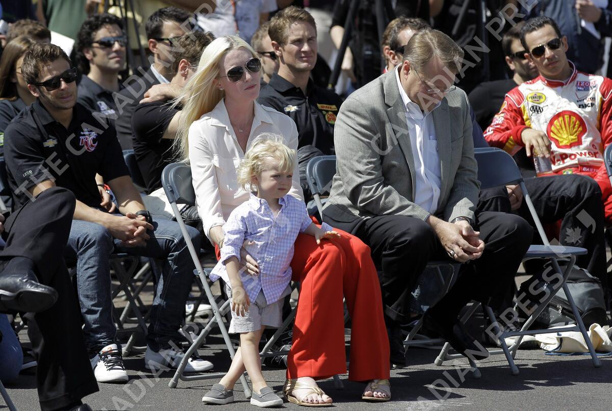 FILE - In this March 7, 2012, file photo, Susie Wheldon, widow of IndyCar driver Dan Wheldon, front row left, holds her son Sebastian as she sits with Bill Foster, Mayor of St. Petersburg, front row right, and several drivers in St. Petersburg, Fla. The IndyCar Series has bounced from one problem to another all season as it scrambles for viewers and new fans. It heads into the season finale this weekend after suffering the worst possible blow: The death of a driver, with Justin Wilson dead at 37 from injuries suffered in a crash. (AP Photo/Chris O'Meara, File)