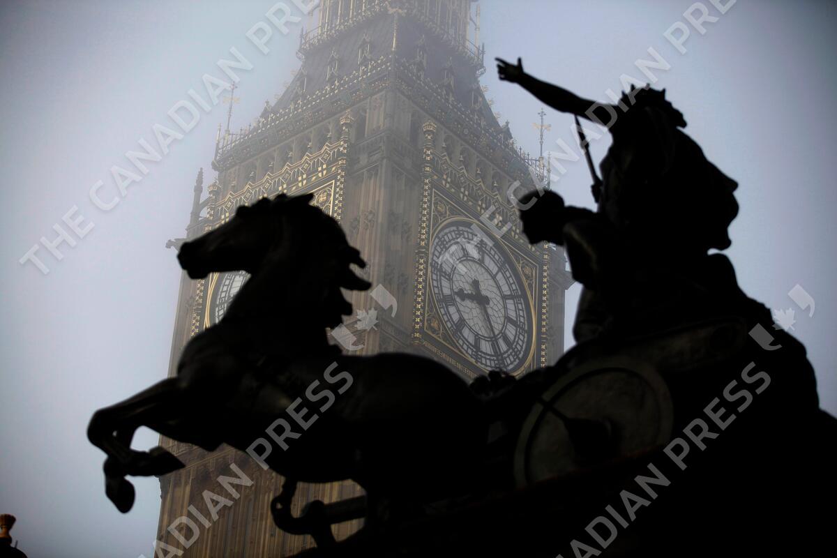 FILE - In this Thursday, March 15, 2012 file photo, the Boudica statue stands in the foreground as fog shrouds the clock tower which houses the Big Ben bell at the Palace of Westminster, London. Officials on Tuesday, Aug. 25, 2015 said that the famous clock at Britain's Parliament, used by people across Britain to check the time, has recently been slow by as much as six seconds. (AP Photo/Matt Dunham, File)