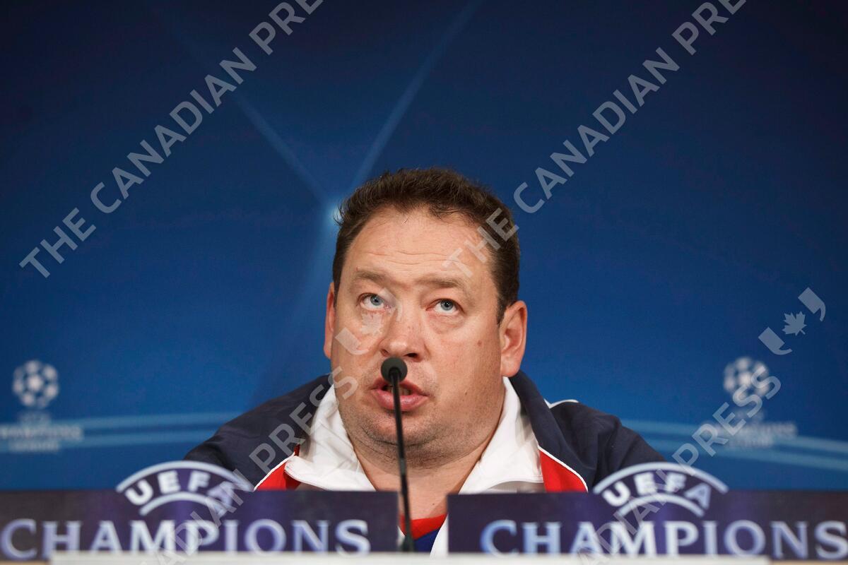 FILE - In this Tuesday, March 13, 2012 file photo CSKA Moscow's coach Leonid Slutsky during a press conference at the Santiago Bernabeu stadium during a training session, one day ahead of a Champions League round of 16, second leg soccer match against Real Madrid, in Madrid. Russia appointed CSKA Moscow's Leonid Slutsky as the new national soccer coach on a short-term deal to rescue its 2016 European Championship qualifying campaign on Friday, Aug. 7, 2015. Slutsky replaces Fabio Capello, who departed last month after poor results left Russia sitting third in Group G, outside the automatic qualifying places.(AP Photo/Daniel Ochoa de Olza, file)