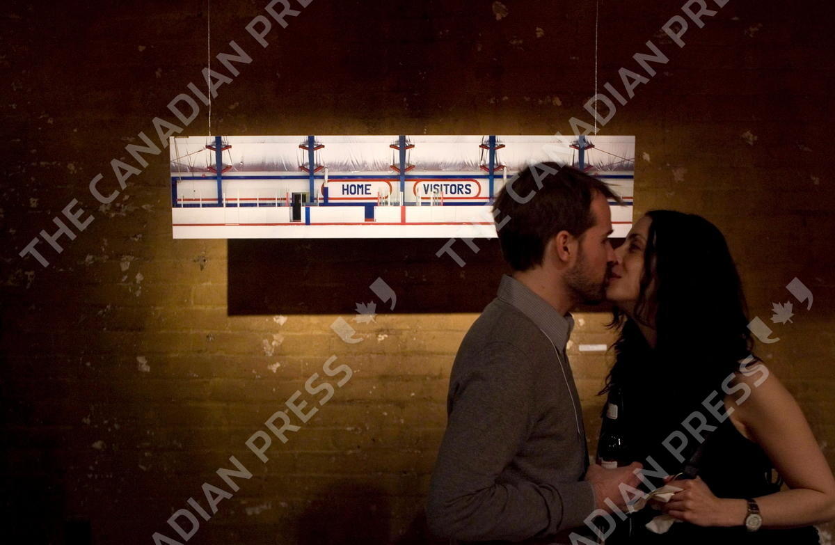 An unidentified couple share a kiss infront of artwork at the Time Raiser art auction in Toronto, on Saturday March 21, 2009. Bidders pledge hours of volunteer service to charitable organisations in an attempt to secure original artworks from recognised artists. THE CANADIAN PRESS/Chris Young
