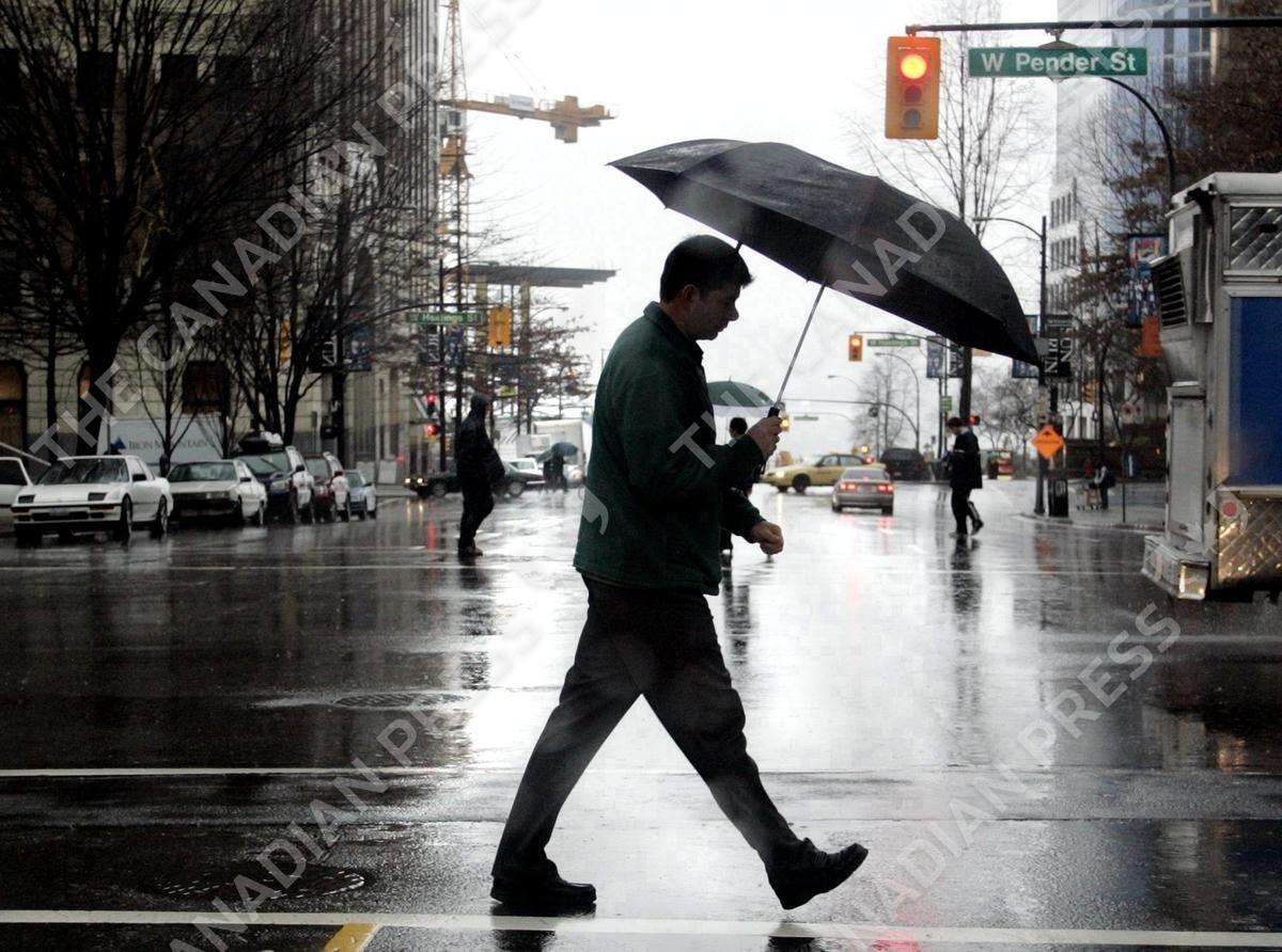 A man makes his way across a downtown Vancoouver street under the cover of an umbrella as the winter rains continue Monday February 19, 2007. The weather office predicts 25-mm of rain for the Vancouver area Monday with rain and showers forecast for the remainder of the week.(CP PHOTO/Chuck Stoody) CANADA