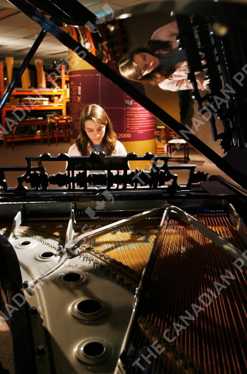 Alyssa Michaud, a music major at Ambrose University, plays the Steinway and Sons "Rhapsody in Blue" grand piano built as she guides a tour of the Cantos Music Collection in Calgary, Sunday, April 26, 2009. The collection boasts over 200 instruments on display that span the evolution of music from 246 B.C. to present day. Among the pipe organs, pianos, synthesizers, is a one of a kind harpsichord from 1679, and a Kimball Theatre Organ from 1924.THE CANADIAN PRESS/Jeff McIntosh