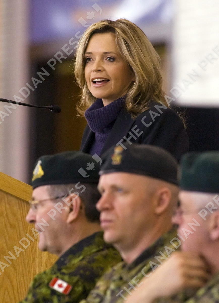 Intergovernmental Affairs Minister Josee Verner talks to the military personel leaving on a six month deployment to Afghanistan, during a ceremony at CFB Valcartier, north of Quebec City, on Friday February 27, 2009. THE CANADIAN PRESS/Clement Allard