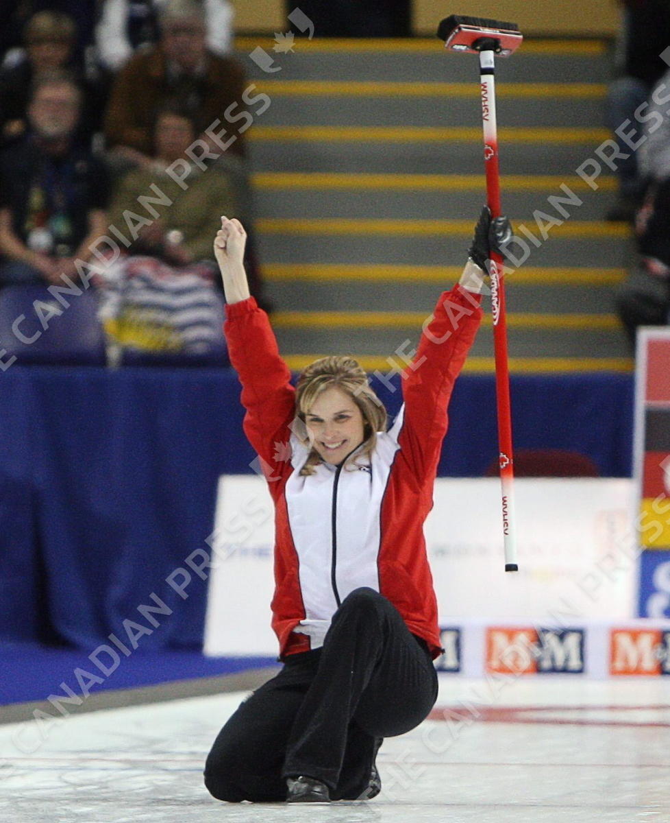 Team Canada skip Jennifer Jones celebrates as she defeats B.C. skip Marla Mallett 8-5 to win the Scotties Tournament of Hearts final in Victoria, B.C. Sunday March 1, 2009. THE CANADIAN PRESS/Jonathan Hayward