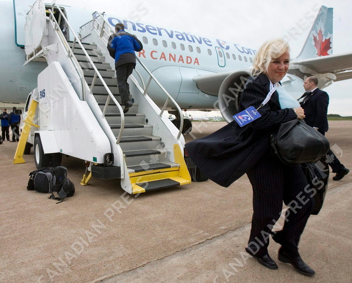 Conservative party leader Stephen Harper's stylist Michelle Muntean carries her supplies from the campaign plane upon arrival in Summerside, P.E.I., on Friday Sept. 12, 2008. THE CANADIAN PRESS/Tom Hanson