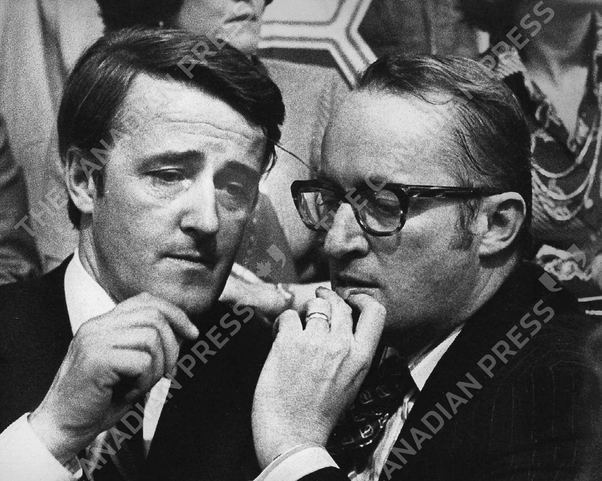 (CPT34-Nov.14)--NAMED IN REPORTS--Six years after they first heard allegations of bribery in the sale of Airbus jetliners to Air Canada the RCMP have revived their investigation. Among those named in news reports in March, 1995 relating to the case were former prime minister Brian Mulroney (left) and former Newfoundland premier Frank Moores (right). The pair are shown in this 1976 photo at the Conservative leader convention in Ottawa. (CP PHOTO) 1995 (Files-CP)RjB2125edt