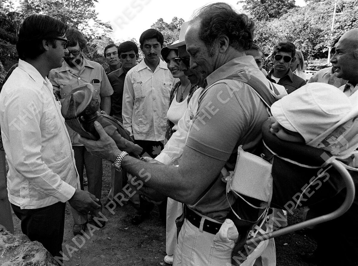 Michel Charles Emile, son of Prime Minister Trudeau, tries to get a close look at a pre-Hispanic doll held by his father Jan. 26, 1976- during a visit by the Prime Minister and hs wife, (C), to the Mayan ruins of Palenque on the Yucatan peninsula. (CP PHOTO/ Fred Chartrand)