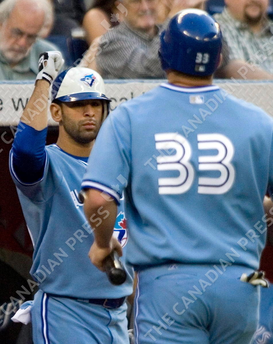 The Toronto Blue Jays' Jose Bautista, left, celebrates with teammate Scott Rolen after Rolen scored the game's first run after an Alex Rios RBI single during fourth inning interleague baseball action against the Philadelphia Phillies in Toronto on Friday, June 26, 2009. THE CANADIAN PRESS/Darren Calabrese