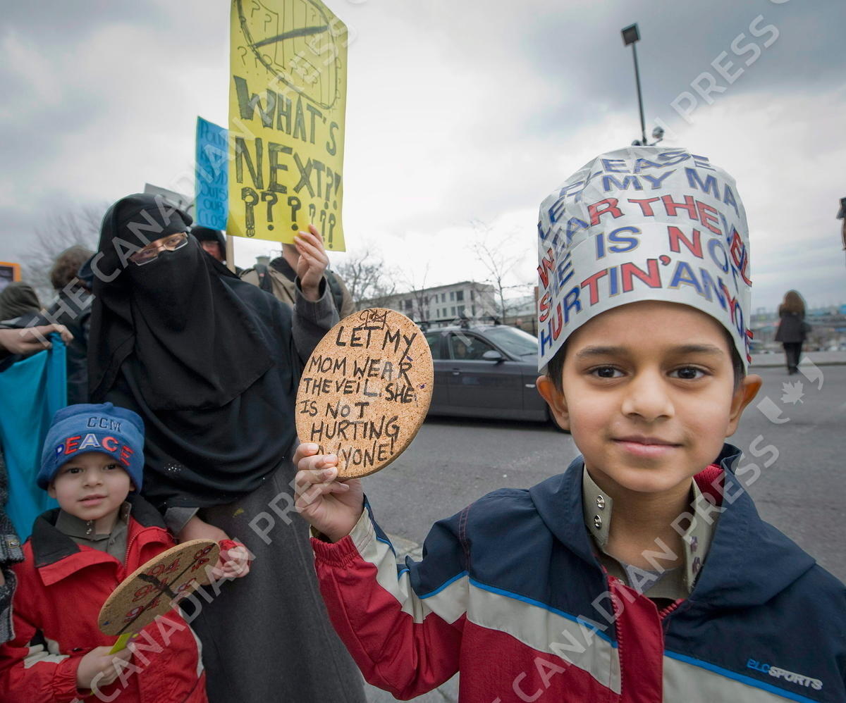 A young boy sopports his mother, as they join approximately 60 others in front of Montreal City Hall, protesting Bill 94 the Quebec Government tabled to require people to uncover their faces to identify themself in order to receive government services on Saturday, April 17, 2010. THE CANADIAN PRESS/Peter McCabe