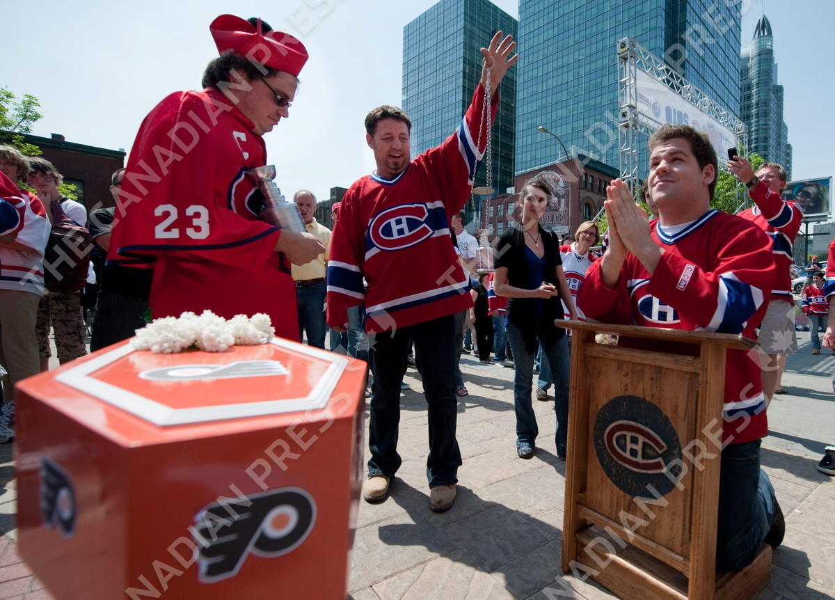 Montreal Canadiens fans hold a mock funeral for the Flyers outside the Bell Centre in Montreal, before the start of game 4 between the Montreal Canadiens and Philadelphia Flyers on Saturday, May 22, 2010. THE CANADIAN PRESS/Peter McCabe
