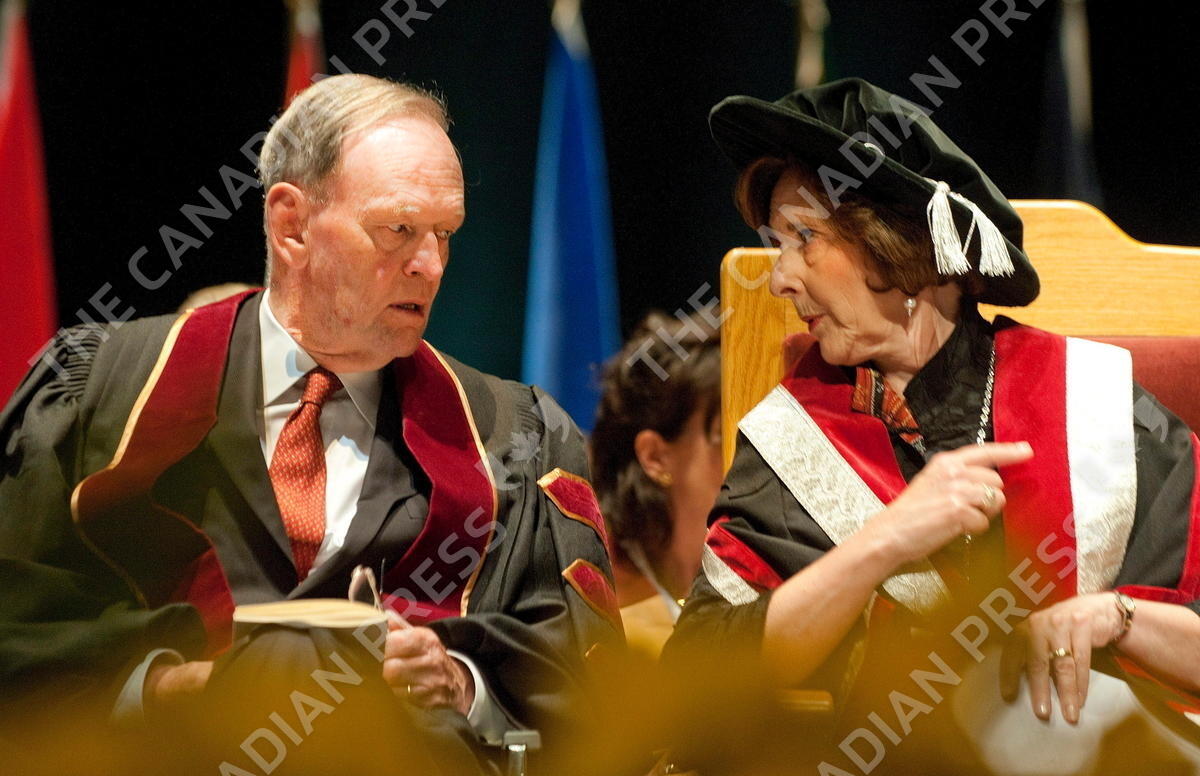 Canada's 20th Prime Minister, Jean Chretien speaks with Concordia President and Vice-Chancellor Judith Woodsworth prior to speaking and receiving a honorary doctorate from Concordia University in Montreal on Tuesday June 22, 2010. THE CANADIAN PRESS/Peter McCabe