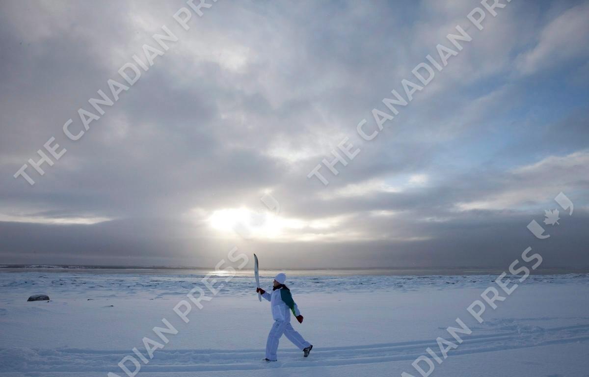 Torchbearer Cindy Koneak carries the Olympic Flame along a beach in Kuujjauq, Que. Tuesday, Nov. 10, 2009. The Olympic Flame which traveled all the way from Olympia in Greece is now on a 106 day cross country relay which will end in Vancouver on Feb. 12, 2010 to mark the start of the Vancouver 2010 Winter Olympic Games. THE CANADIAN PRESS/Jonathan Hayward