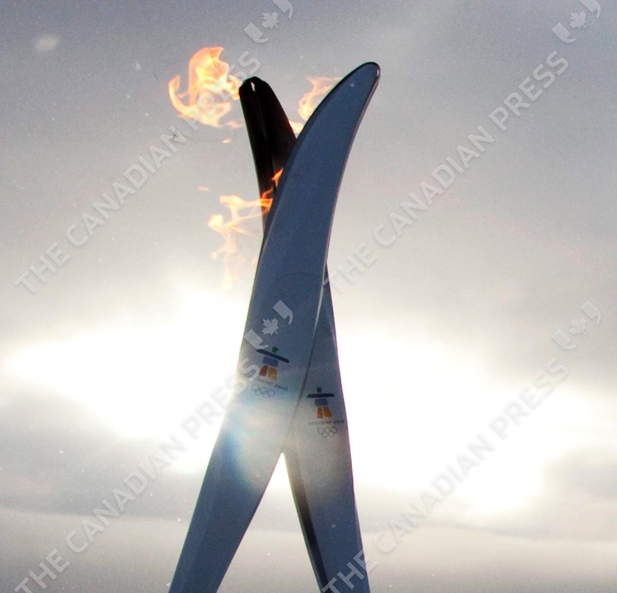 The torches of Lukasi Tukkiapik, right, and Cindy Koneak are seen passing the Olympic Flame to one another on a beach in Kuujjauq, Que. Tuesday, Nov. 10, 2009. The Olympic Flame which traveled all the way from Olympia in Greece is now on a 106 day cross country relay which will end in Vancouver on Feb. 12, 2010 to mark the start of the Vancouver 2010 Winter Olympic Games. THE CANADIAN PRESS/Jonathan Hayward