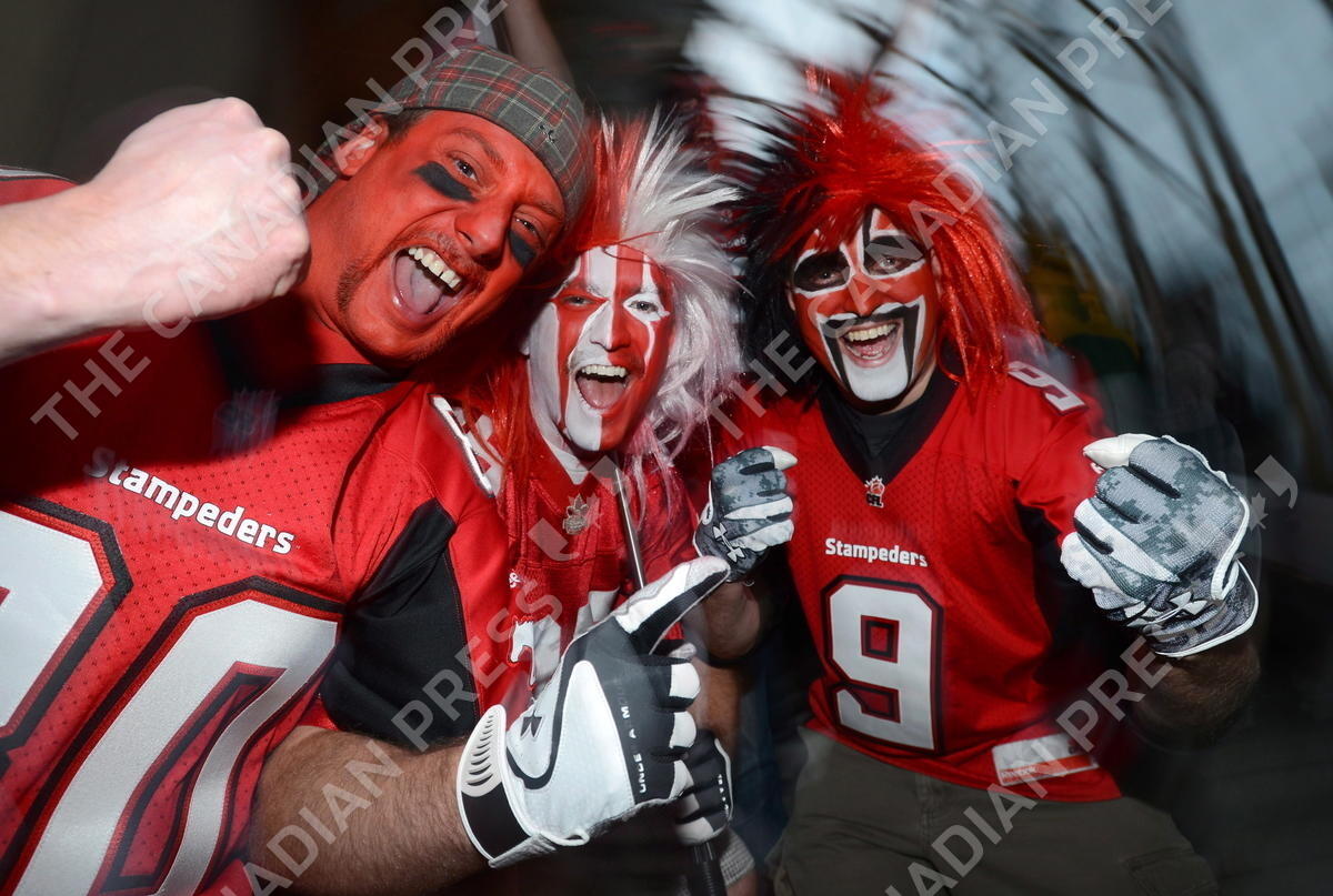 Calgary Stampeders fans, Jason Young, left to right, Luke Ohlhauser and his brother Jade Ohlhauser reacts before the 100th CFL Grey Cup game between Toronto Argonauts and the Calgary Stampeders Sunday November 25, 2012 in Toronto. THE CANADIAN PRESS/Sean Kilpatrick