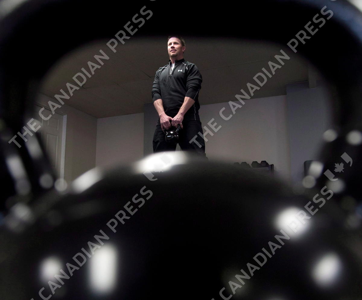 General manager Martin Charron lifts weights for a photo at Downsize Fitness in Orleans, Ont., Tuesday, December 17, 2013. THE CANADIAN PRESS/Adrian Wyld
