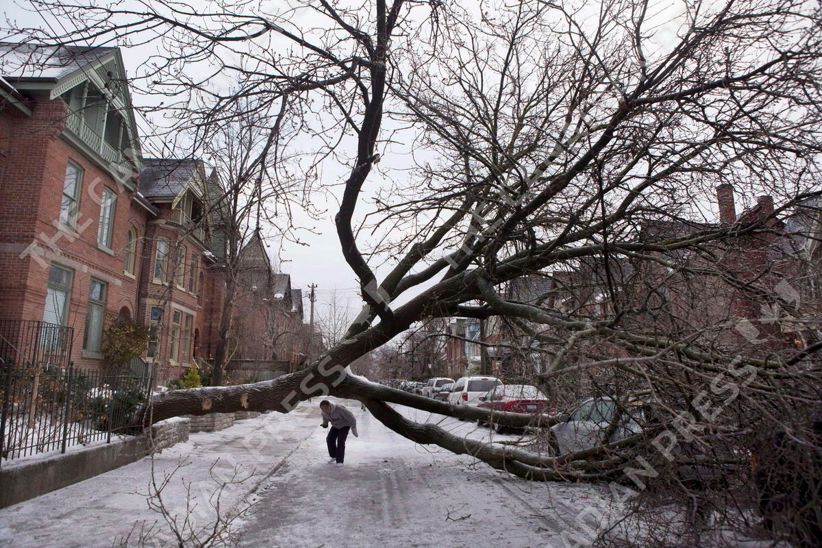 A pedestrian walks under a tree blocking Wellesley Street East following an ice storm in Toronto on Monday, Dec. 23, 2013. The past 12 months or so have given millions of Canadians first-hand experience with why governments urge them to develop household emergency plans that include stores of non-perishable food, bottled water and extra prescription drugs. THE CANADIAN PRESS/Matthew Sherwood