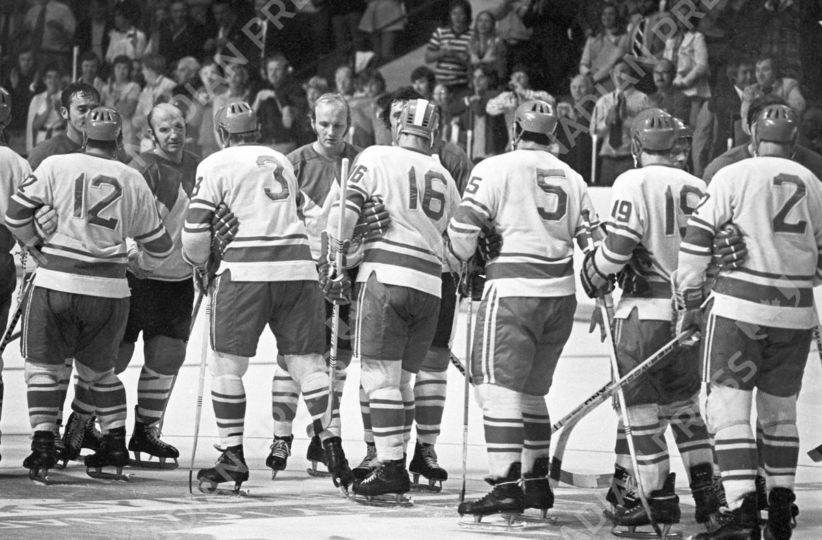 Team USSR and Team Canada players shake hands during the 1972 Summit tournament in Toronto on Sept. 4, 1972. The Canadian Press/Peter Bregg