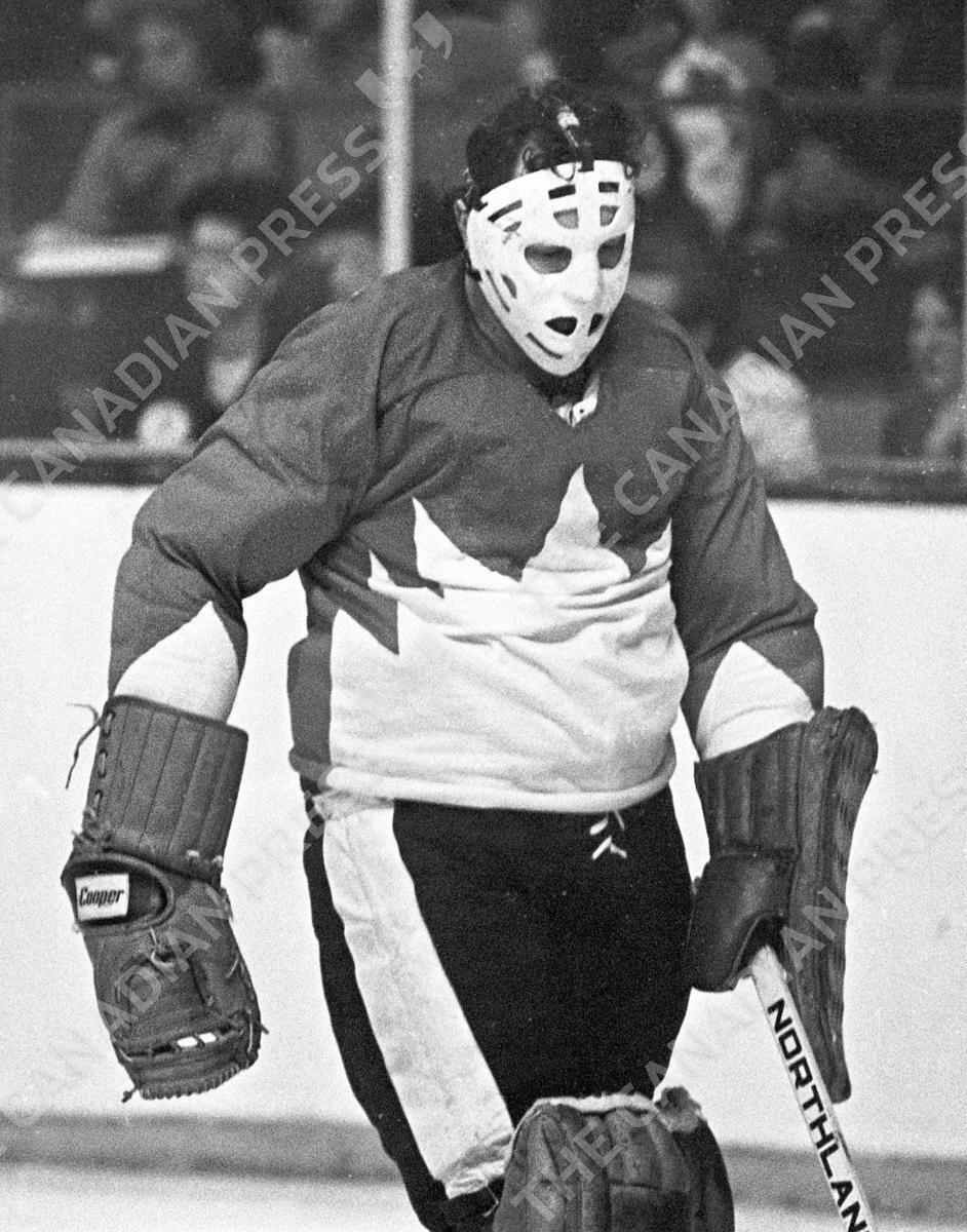 Team Canada's Tony Esposito waits for action to continue during the 1972 Summit tournament against the Soviet Union in Toronto on Sept. 4, 1972. The Canadian Press/Peter Bregg