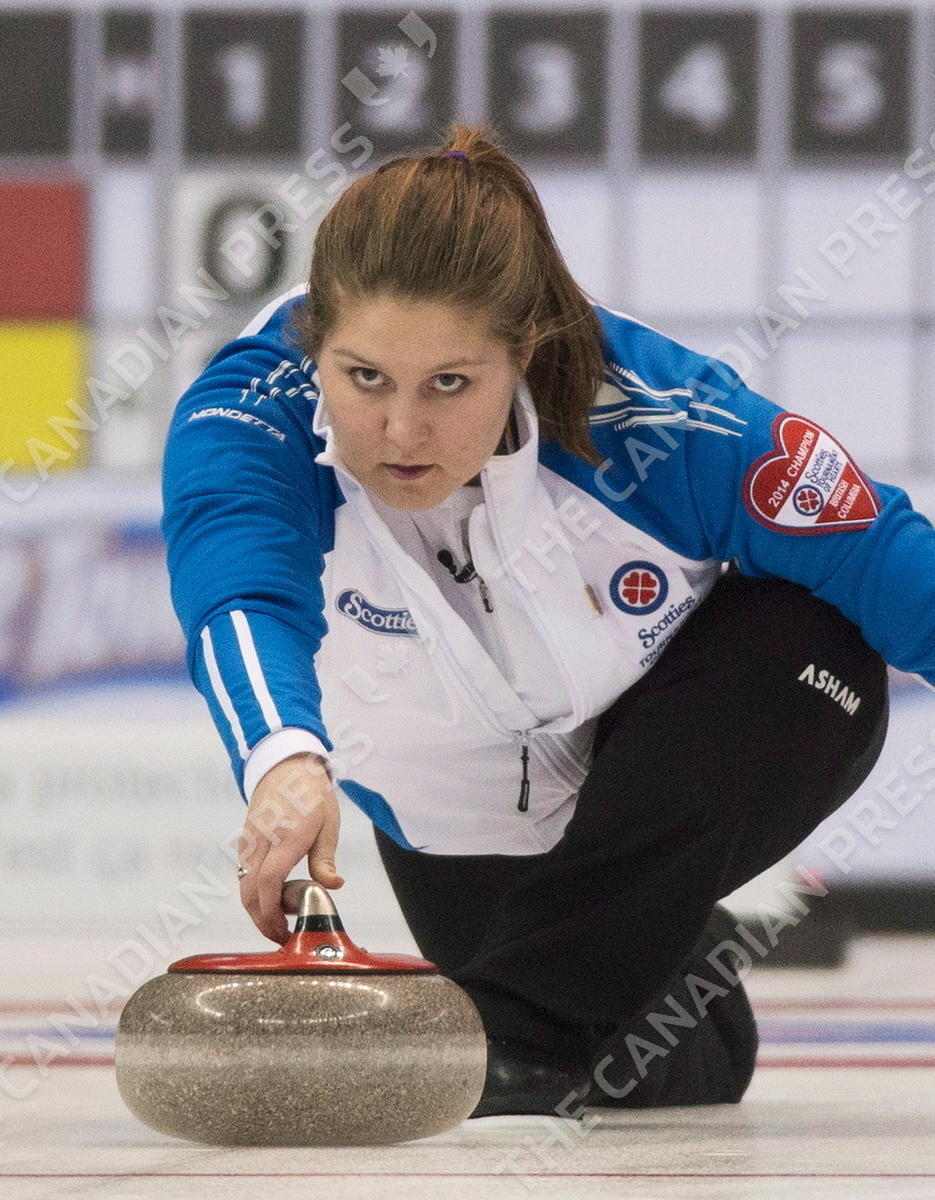 Team British Columbia skip Kesa Van Osch delivers her rock during draw one curling action against team Prince Edward Island at the Scotties Tournament of Hearts in Montreal Saturday, February 1, 2014. THE CANADIAN PRESS/Graham Hughes