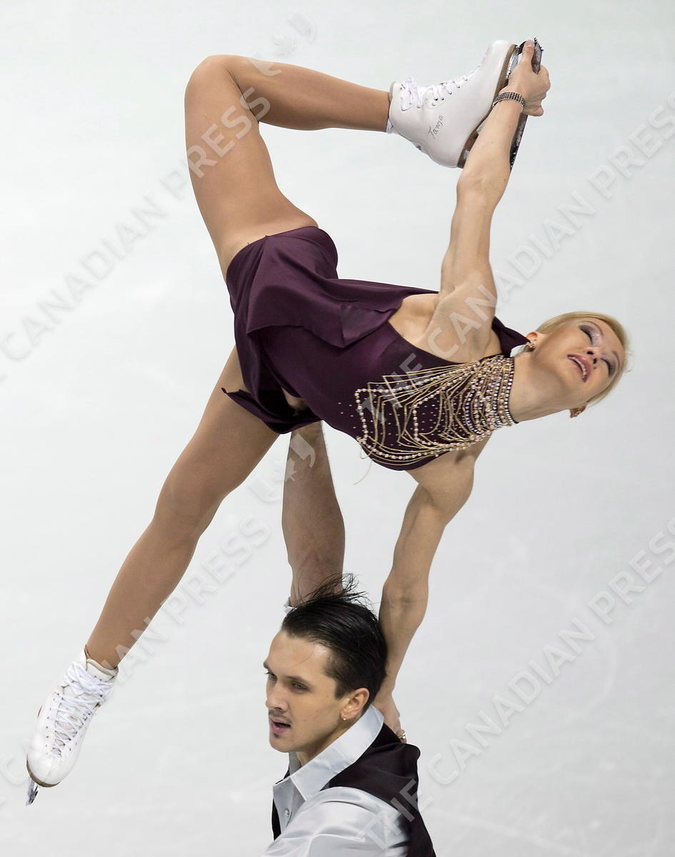 Tatiana Volosozhar and Maxim Trankov of Russia perform in the pairs short program as the World Figure Skating Championships in London, Ont., on Wednesday, March 13, 2013. THE CANADIAN PRESS/Frank Gunn