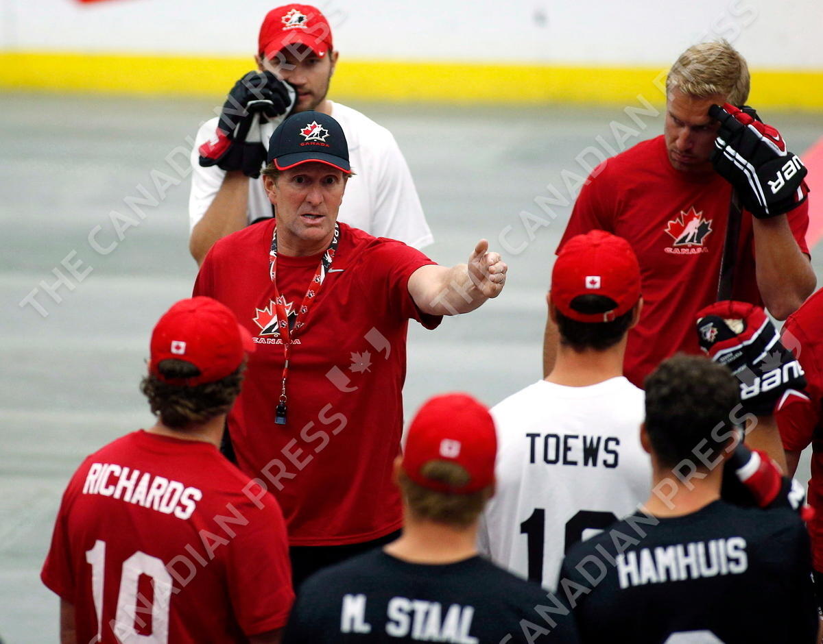 Head coach Mike Babcock gives instructions during a ball hockey training session at the Canadian national men's team orientation camp in Calgary, Alta., Tuesday, Aug. 27, 2013. From ball hockey to a gold medal, Team Canada put on a historic, dominant show at the Sochi Olympics. THE CANADIAN PRESS/Jeff McIntosh