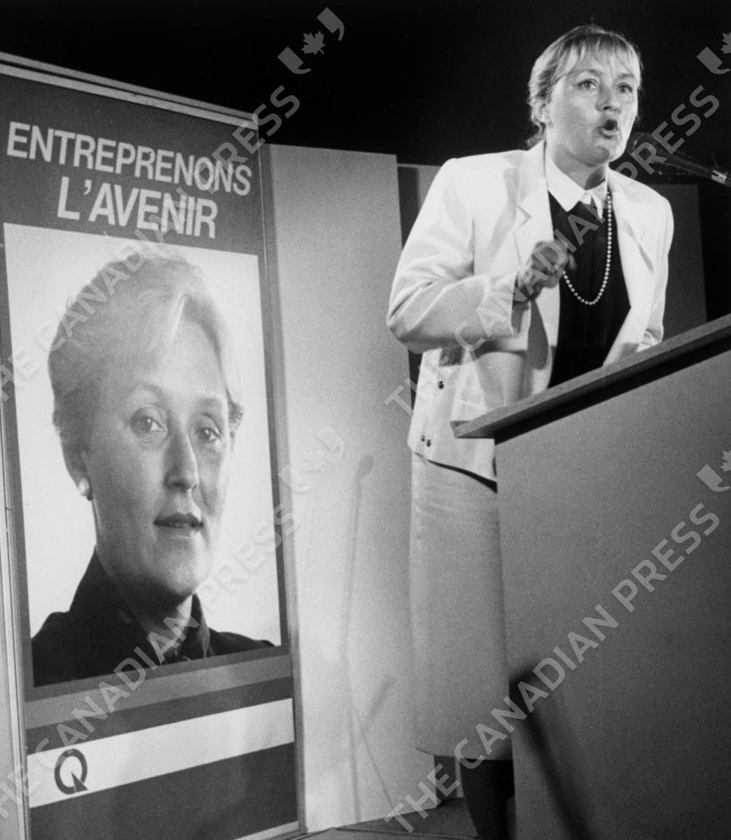 PQ leadership candidate Pauline Marois appears before a poster herself as she speaks at an all-candidates meeting in Laval, Que., Sept. 4, 1985. THE CANADIAN PRESS/Bill Grimshaw